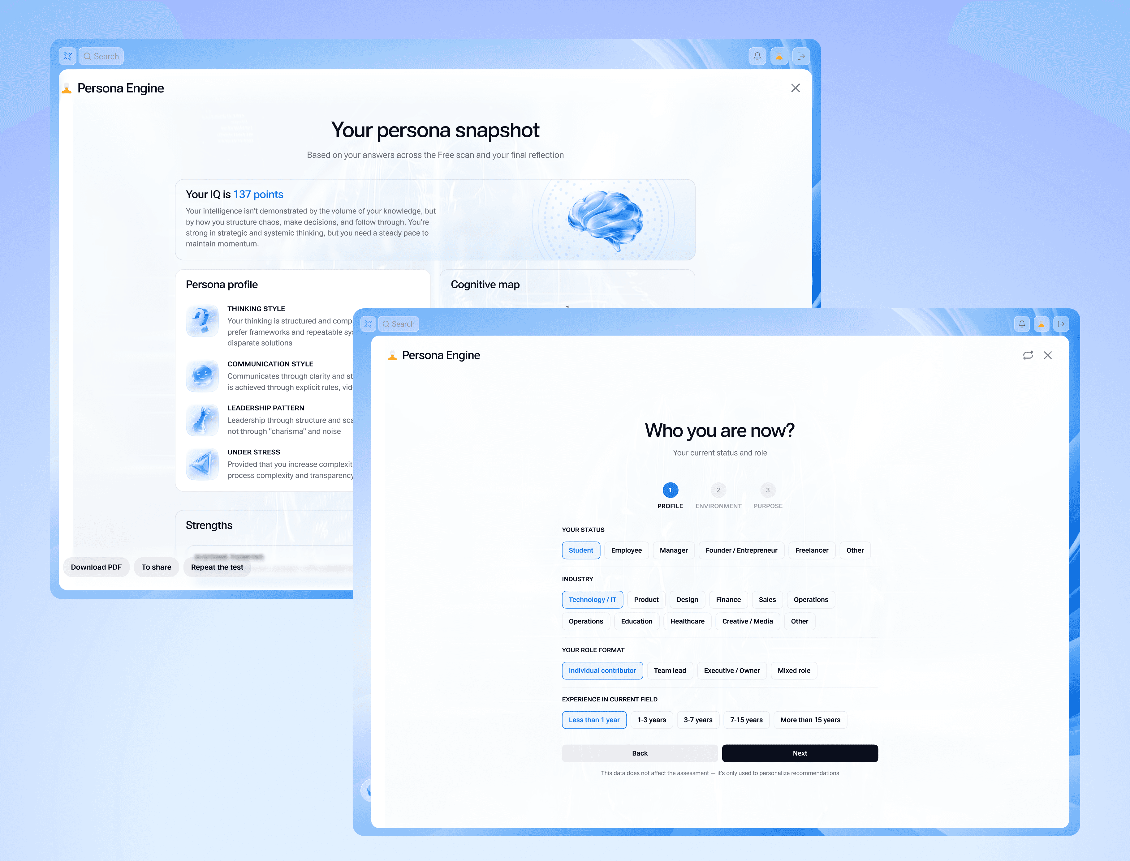 AlexMind AI OS can take into account not only the task context but also the user's characteristics—thinking style, decision-making approach, and information perception format. By using Persona EngineThe system creates a personalized interaction profile that helps tailor recommendations, interface, and AI logic to the individual. As a result, interaction with the system becomes more natural, and conclusions and recommendations become more relevant.