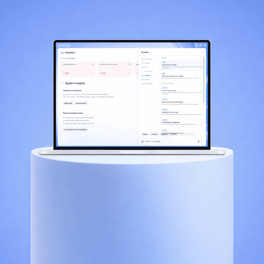 AlexMind AI OS brings together analysis, insights, and actions in a single workspace—so you can understand, make decisions, and run scenarios without switching between tools.
