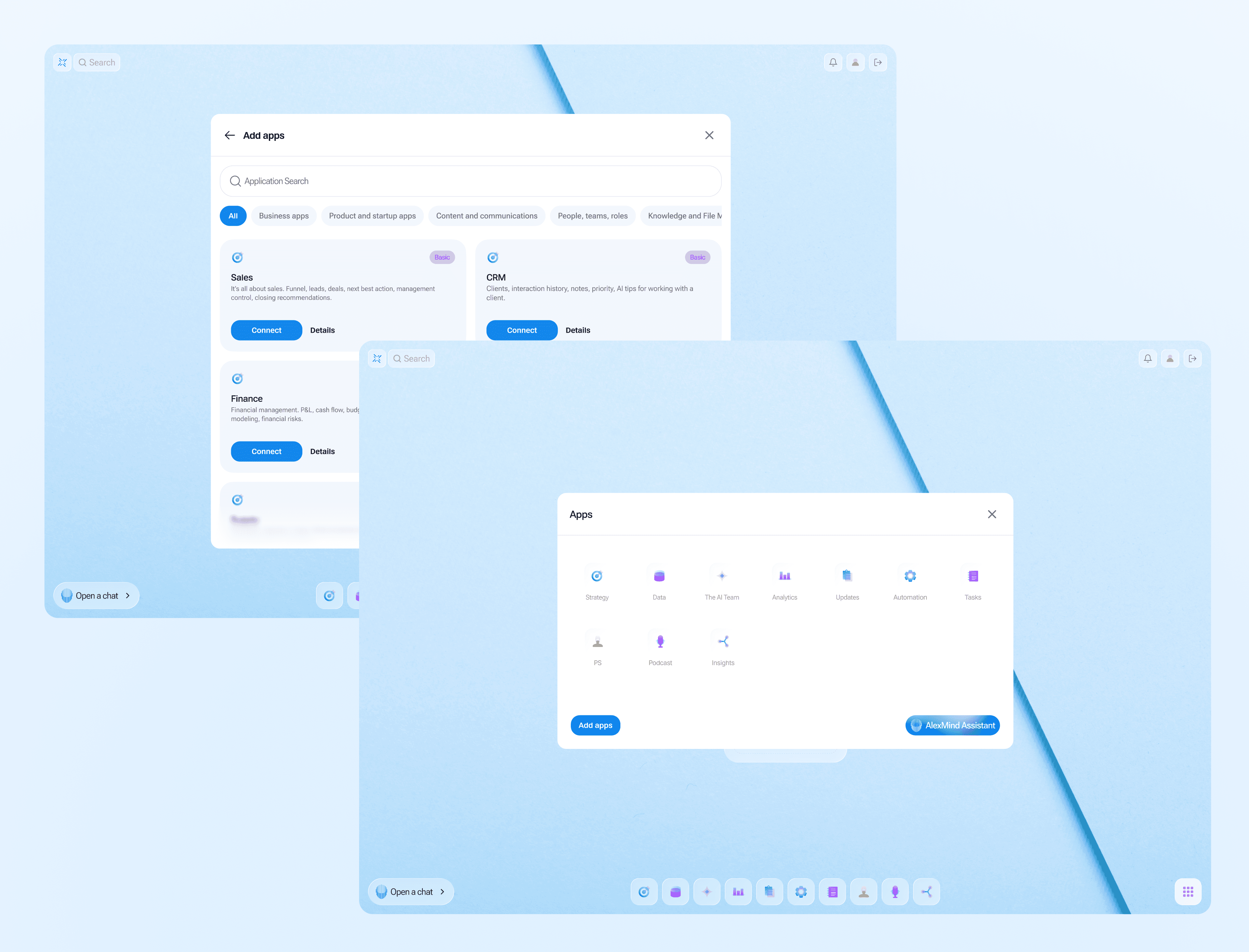 AlexMind AI OS works as an application system. You connect the apps you need for analysis, creation, tasks, personalization, and automation—and assemble a workspace tailored to your needs.