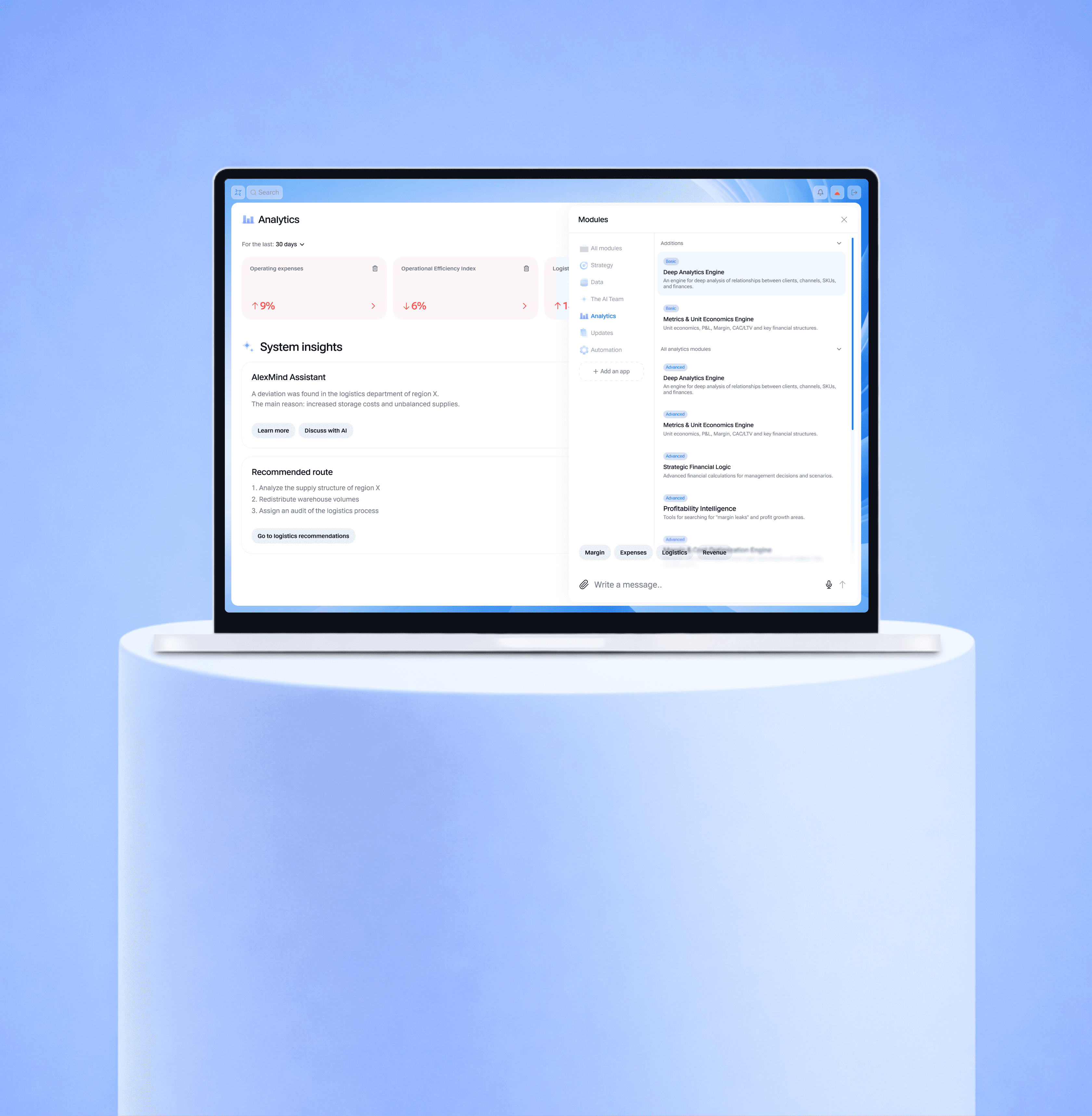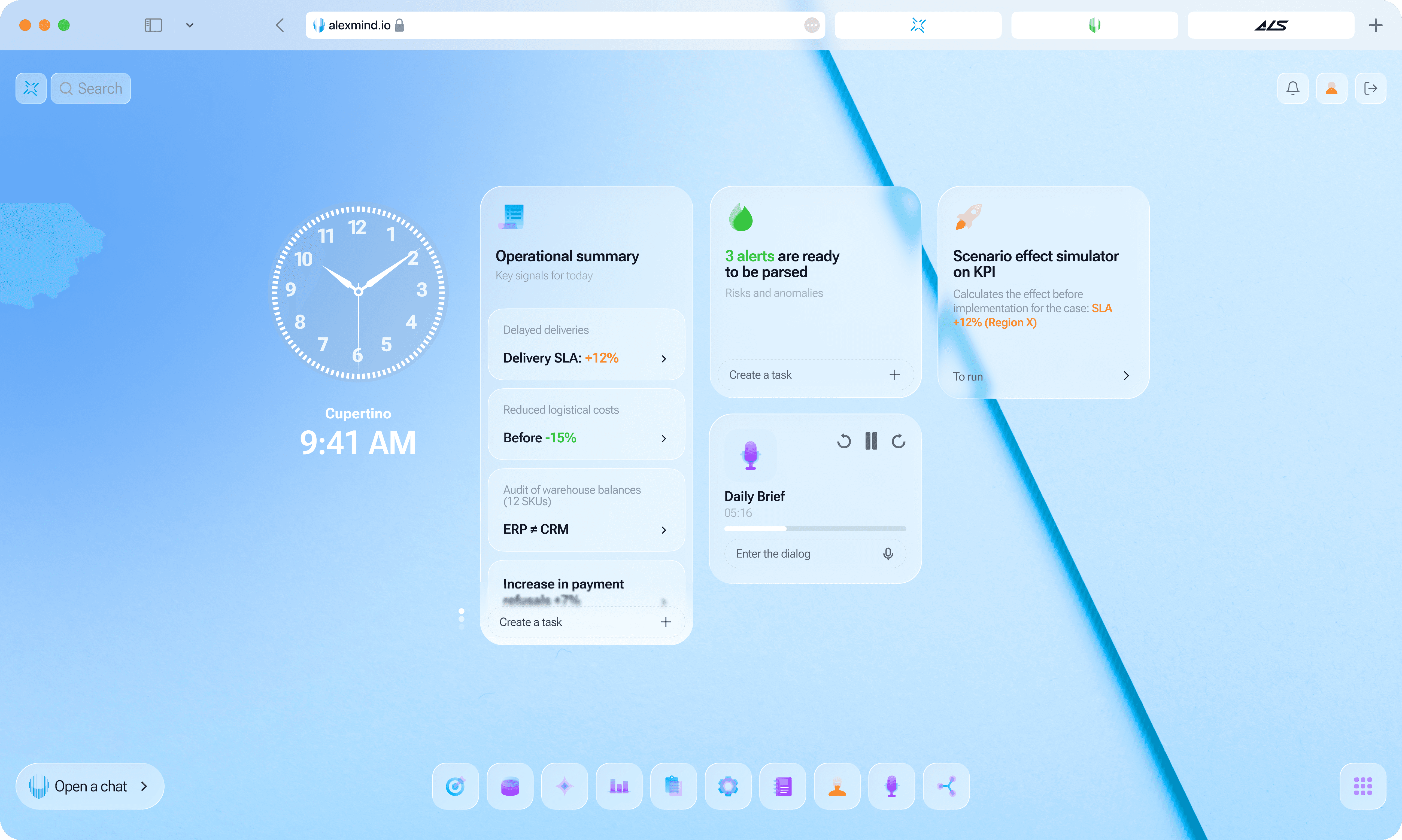 AlexMind AI OS brings together analytics, AI agents, apps, tasks, documents, and automation in a single workspace. In this system, data, conclusions and actions are linked. Insights turn into solutions, solutions into tasks, tasks into real changes. Instead of dozens of disparate services, a unified intelligent environment is emerging, where AI becomes part of everyday work.