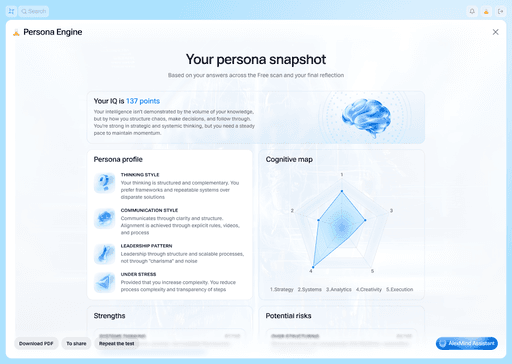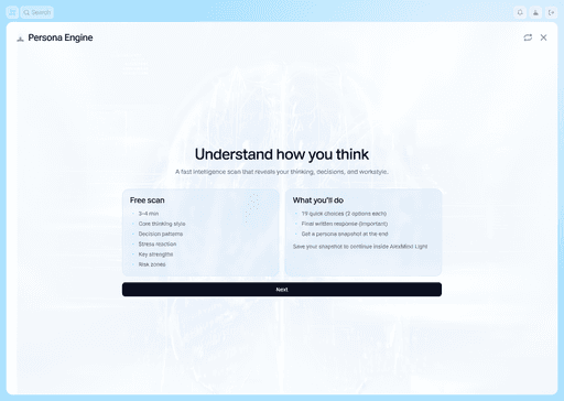 AlexMind AI OS can take into account not only the task context but also the user's characteristics—thinking style, decision-making approach, and information perception format. By using Persona EngineThe system creates a personalized interaction profile that helps tailor recommendations, interface, and AI logic to the individual. As a result, interaction with the system becomes more natural, and conclusions and recommendations become more relevant.