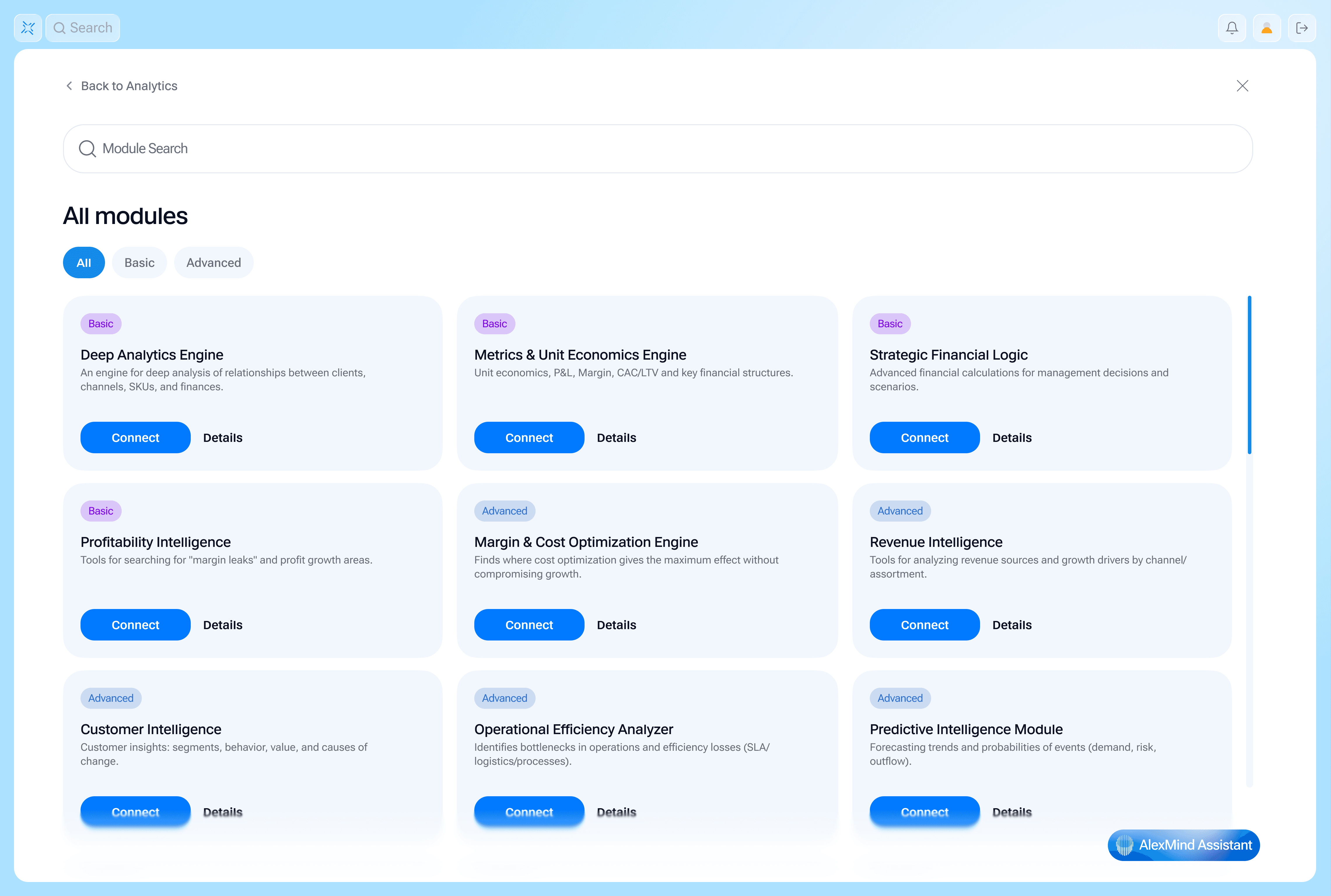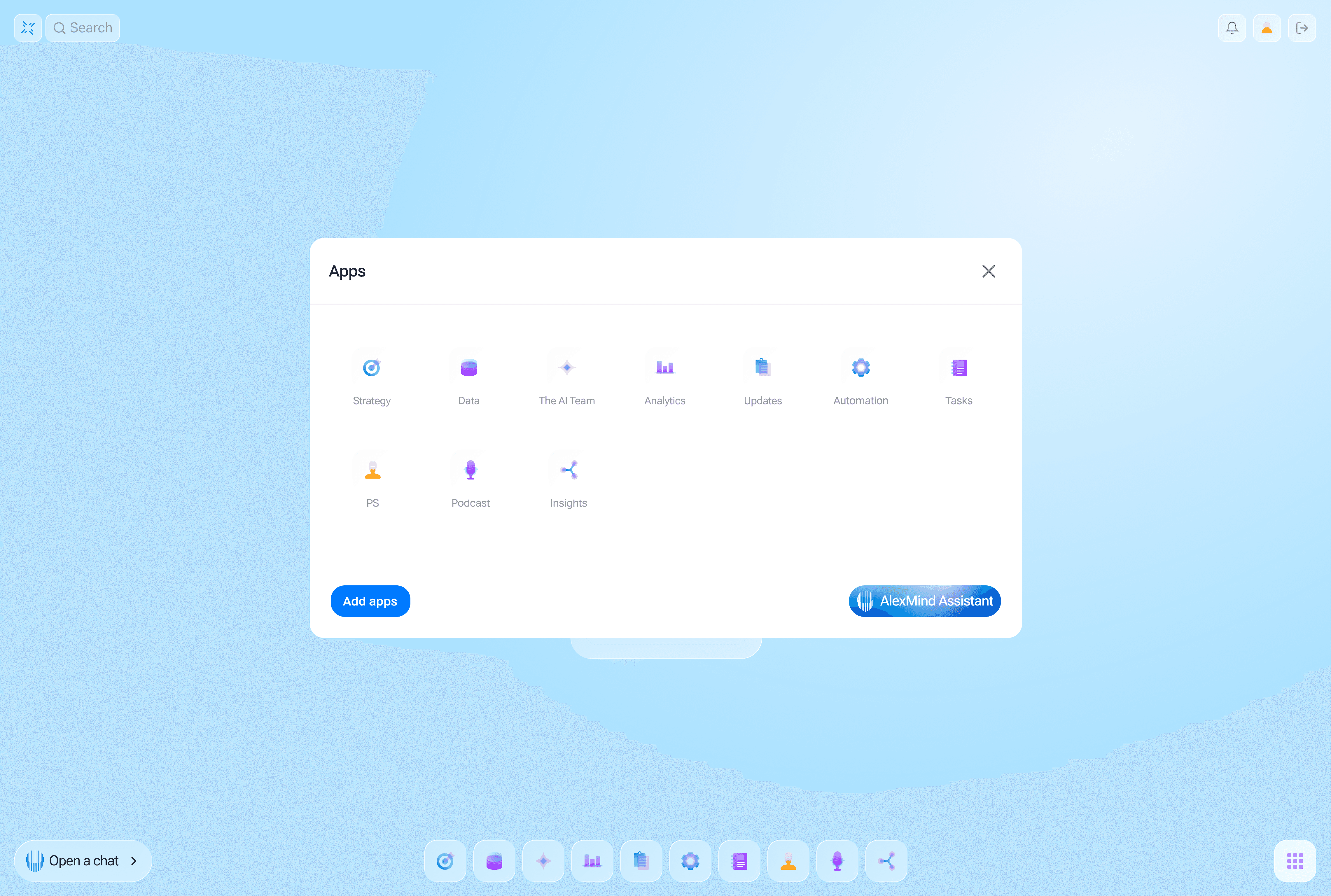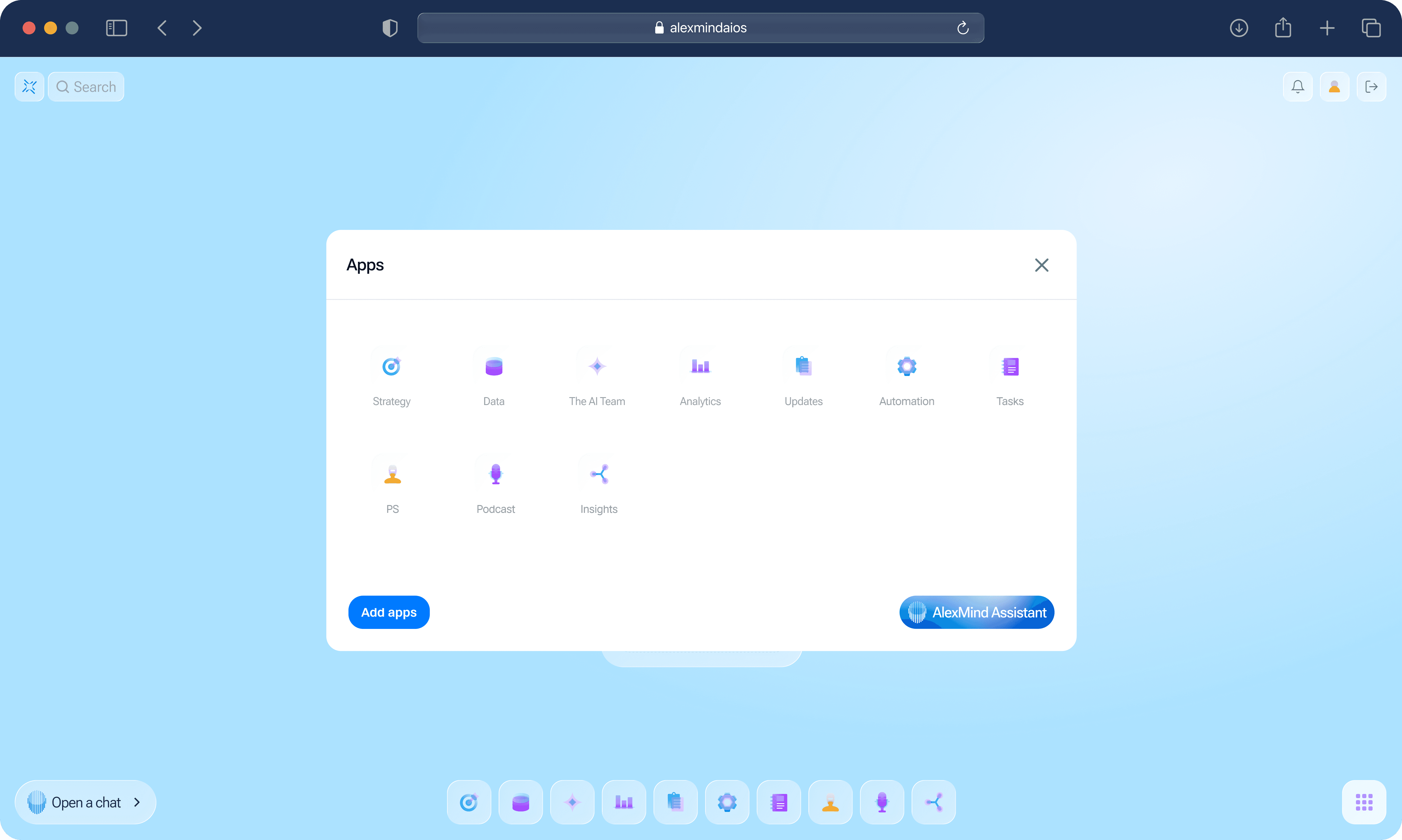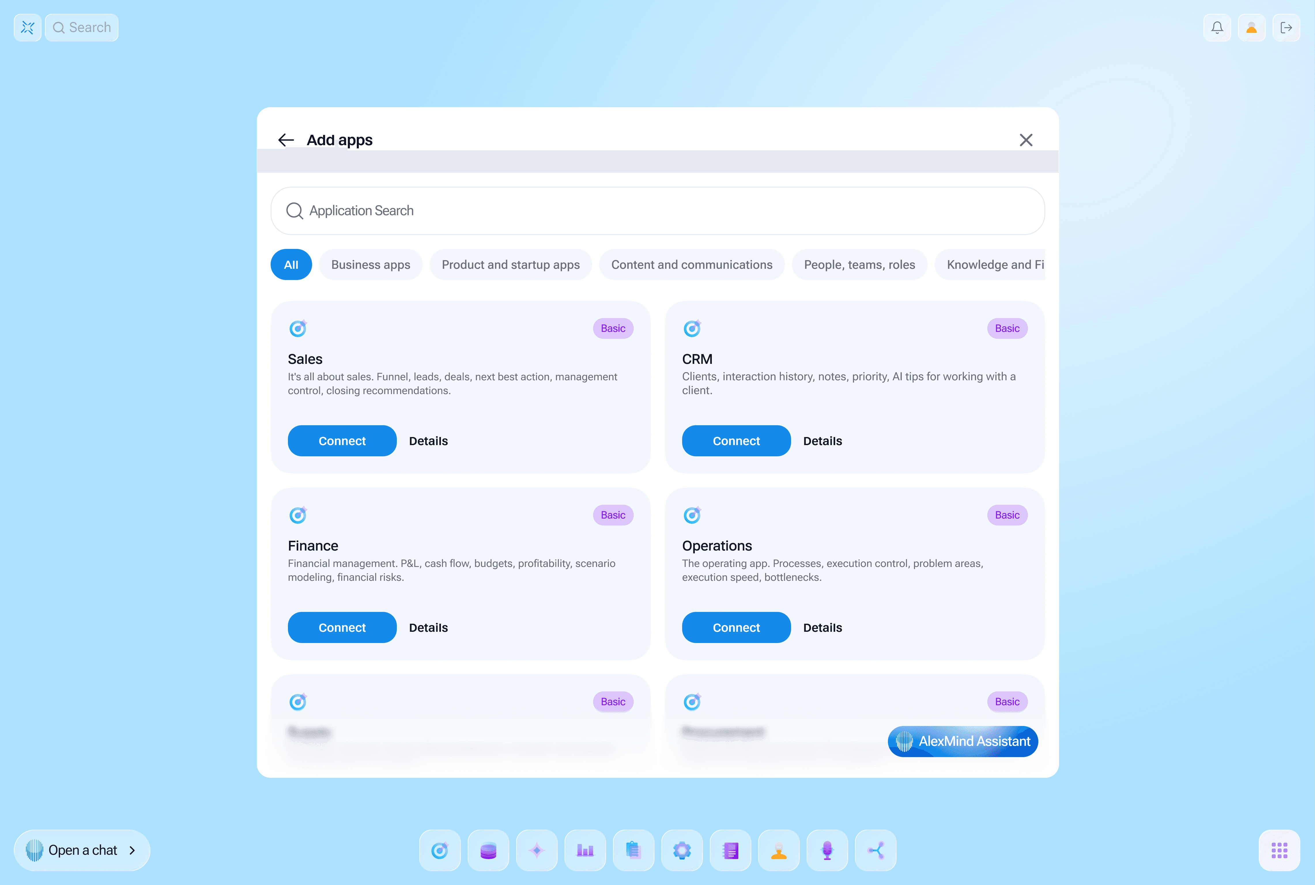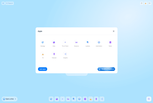 AlexMind AI OS works as an application system. You connect the apps you need for analysis, creation, tasks, personalization, and automation—and assemble a workspace tailored to your needs.